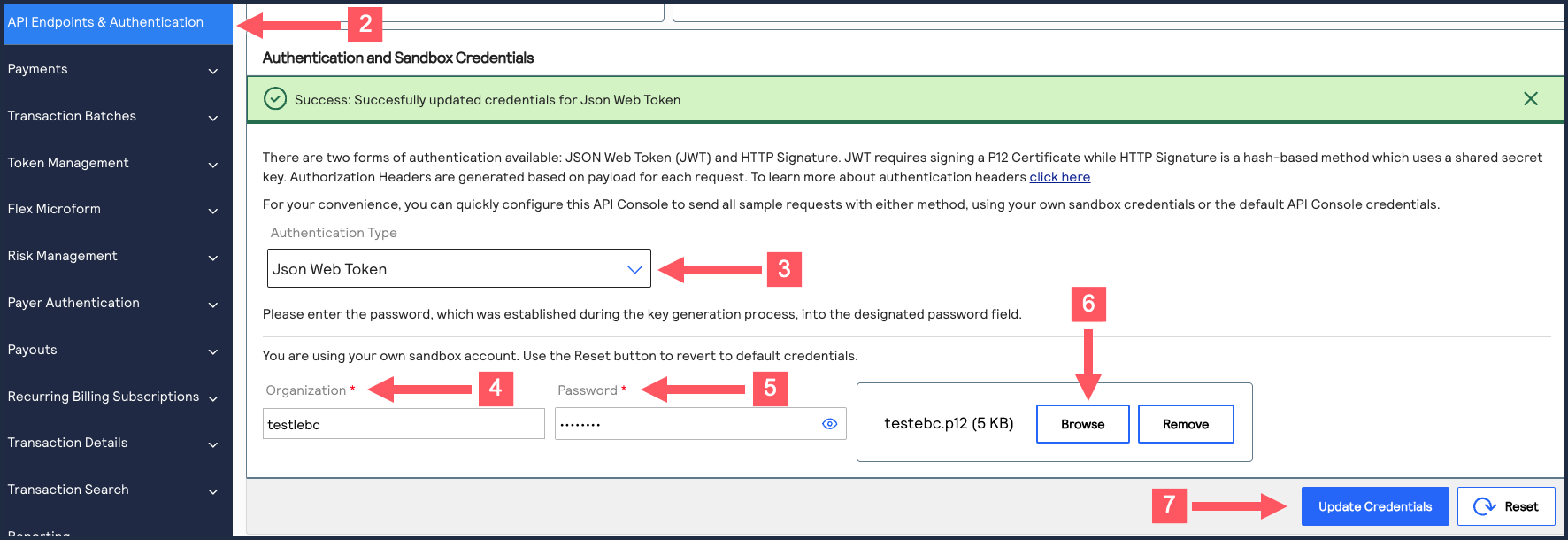 - Under Authentication and Sandbox Credentials, go to the Authentication Type drop-down menu and chooseJSON Web Token.