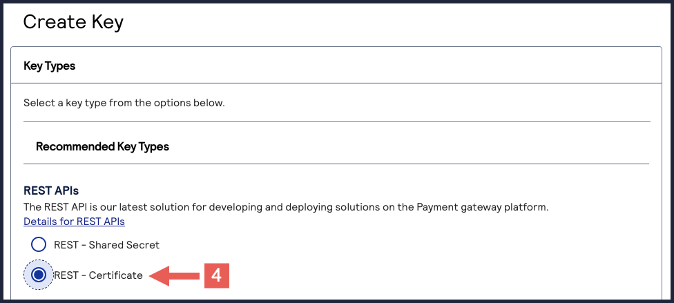 - Under REST APIs, chooseREST – Certificate, and then clickGenerate key.If you are using aportfolioaccount, the Key options window appears, giving you the choice to create a meta key. For more information about how to create a meta key, see Meta Key Set Up.