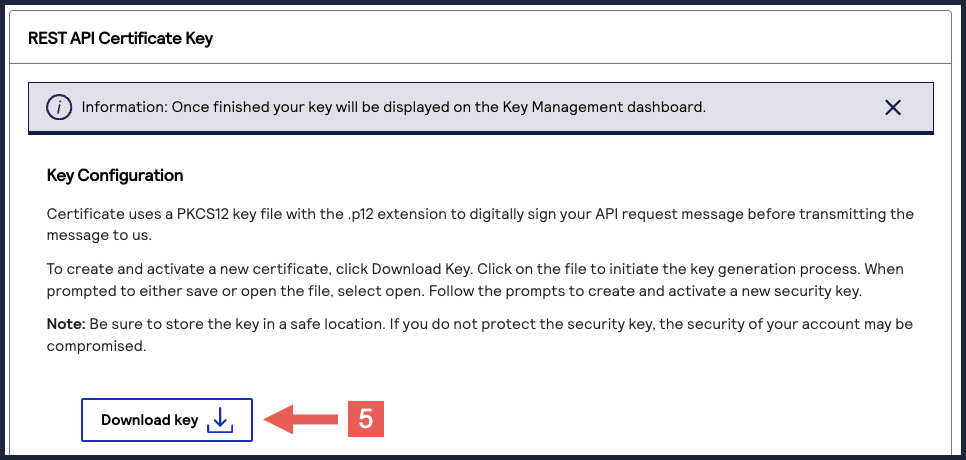 The.p12file downloads to your desktop.If prompted by your system, approve the location for where the key downloads.